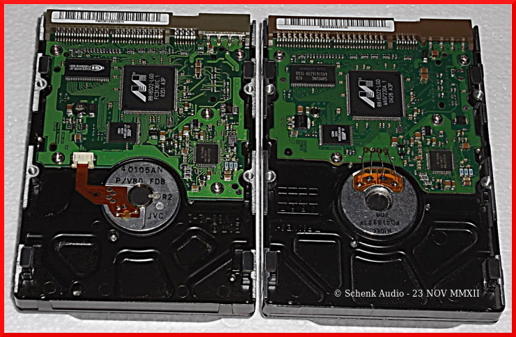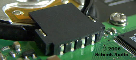 Ein zweites Modell gleichen Typs zeigte nach rund zwei Jahren störungsfreien Laufs Aussetzer, die sich solange häuften, bis Daten einer Partition verstümmelt wurden. Ein Blick auf die Steuerplatine ergab, dass sich der Adapter, der mit seinen vier Kontaktzungen auf den vergoldeten Kontaktflächen der Folienplatine des Motors aufliegt, aus seiner Verankerung gelöst hatte. Die beiden Haltestifte hatten sich aus ihren Lötaugen herausgehoben und die vier Zungen keinen Kontakt mehr.