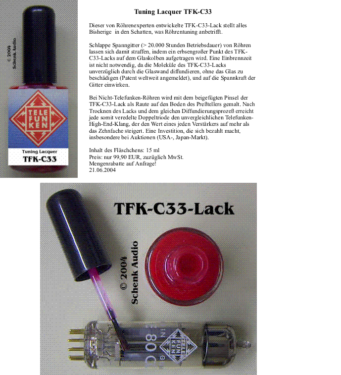 Bekanntlich werden ähnliche Produkte südlich des Weißwurstäquators angeboten, von denen aber abzuraten ist, weil sie in keinem Fall an die präzise Zusammensetzung des TFK-C33-Lacks und dessen Wirksamkeit heranreichen. Es ist doch ein Unding und überfordert den Bastler glattweg, jedes, aber auch jedes Bauteil seines Verstärkers einzustreichen. Diese Pinselorgie kann man mit unserem TFK-C33-Lack vermeiden. Ein Klacks auf den Steuergitteranschluss der Eingangsröhre, und der Verstärker läuft rund wie im Studio.