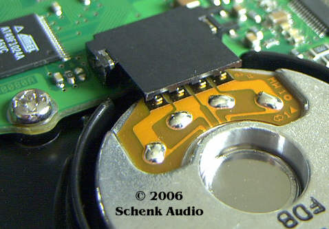 Ein zweites Modell gleichen Typs zeigte nach rund zwei Jahren störungsfreien Laufs Aussetzer, die sich solange häuften, bis Daten einer Partition verstümmelt wurden. Ein Blick auf die Steuerplatine ergab, dass sich der Adapter, der mit seinen vier Kontaktzungen auf den vergoldeten Kontaktflächen der Folienplatine des Motors aufliegt, aus seiner Verankerung gelöst hatte. Die beiden Haltestifte hatten sich aus ihren Lötaugen herausgehoben und die vier Zungen keinen Kontakt mehr.
