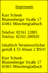Datenschutzerklärung (neudeutsch: Privacy policy) Meine Homepage ist kein geschäftsmäßig erbrachter Teledienst, sondern privater Natur und kann ohne Registrierungszwang von jedermann angeschaut werden. Allerdings weise ich darauf hin, dass bei jedem Besuch Daten auf dem Server abgespeichert werden, die ausschließlich statistischen Zwecken dienen und nicht personenbezogen sind. Eine Ausnahme bilden E-Mails, deren Adresse und Name der Besucher durch Kontaktaufnahme selbst zur Verfügung stellt, aber von mir an Dritte nicht weitergegeben werden. Als Schutz gegen Spambots wird das Impressum als Bild gezeigt und des Weiteren anstelle einer E-Mail-Adresse ein Kontaktformular bereitgehalten. Sollte der Besucher mit dieser Erklärung einverstanden sein, darf er weiterlesen; ansonsten mag er sich verabschieden. ![]() |